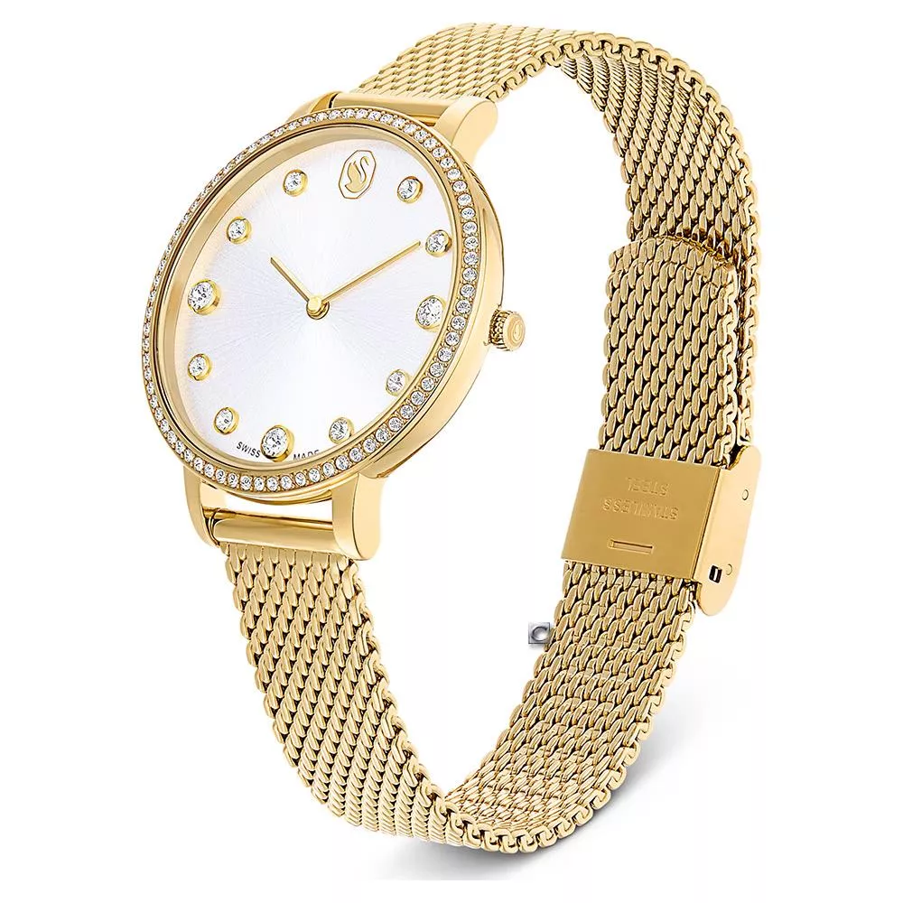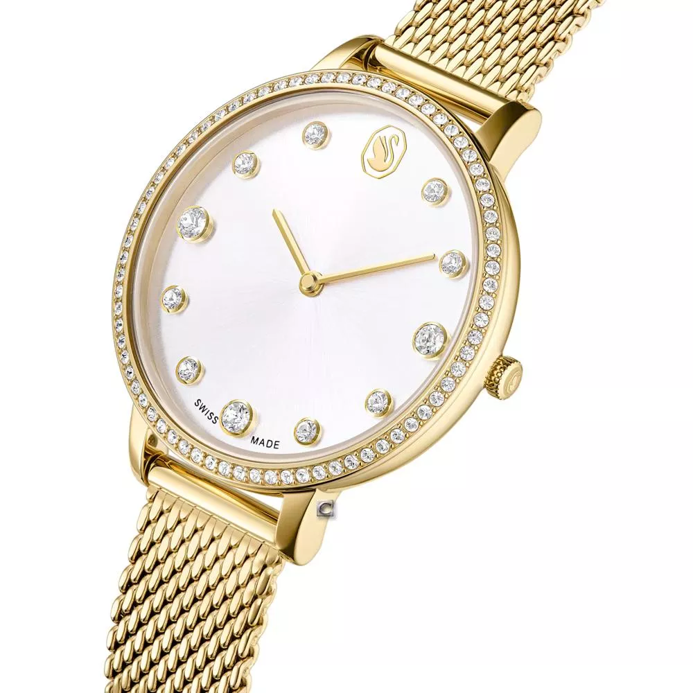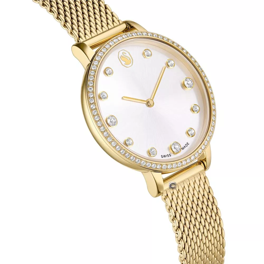 這款時尚的 Clarica 錶款以其代表性米蘭錶鏈為特色,環繞手腕呈現出吸睛的網布風格。這款 35mm 設計採用覆以金色調飾面的不鏽鋼材質精心製作,並搭配鑲有 73 顆透明色 Swarovski 水晶的完美圓形錶圈。在太陽光紋錶盤上,這款時計飾有 11 個水晶指針標示和 12 點鐘位置的天鵝標誌。這款瑞士製錶款防水深度達 50m ,是日常奢華的經典之選。