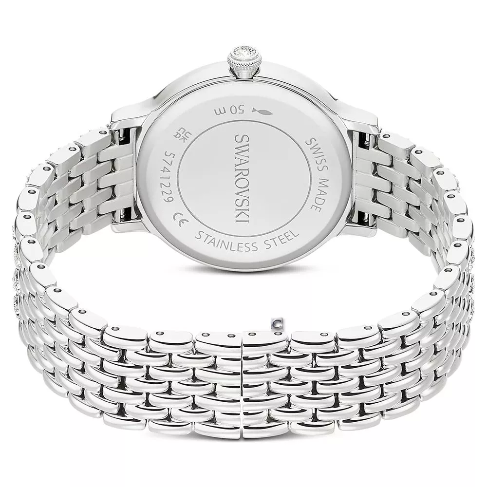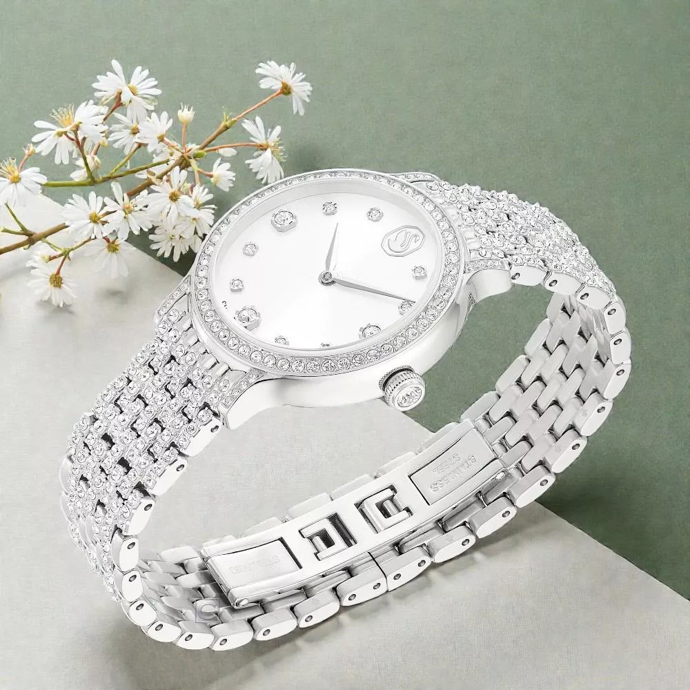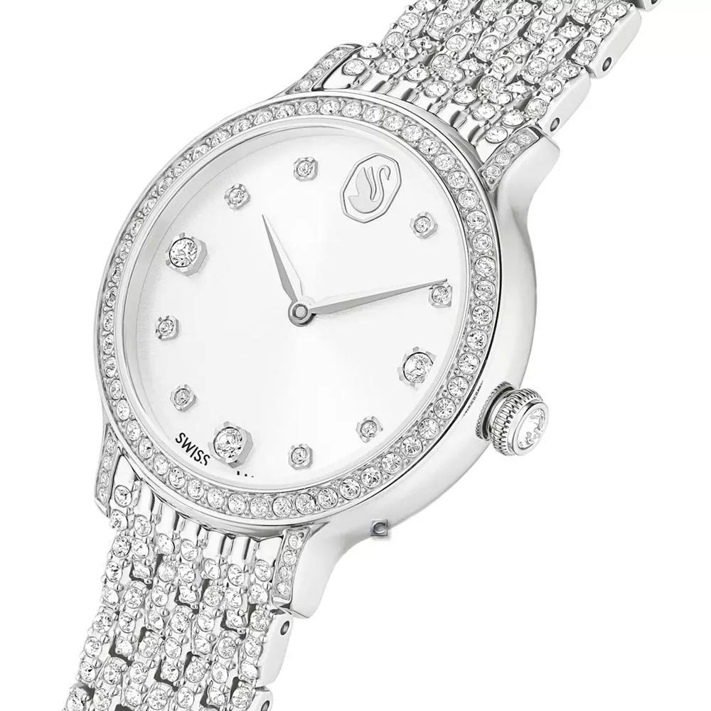這款 31mm 錶款以不鏽鋼材質精心打造,並自 Imber 珠寶系列中金屬與水晶的融合汲取靈感。密鑲錶圈鑲嵌 68 顆單顆水晶,而七鏈式錶鏈則飾有另外 198 顆水晶。太陽光紋錶盤散發額外光芒,其閃耀表面以水晶指針標示點綴,而精緻的天鵝標誌則位於 12 點鐘位置。這款瑞士製錶款防水深度達 50m,是散發迷人魅力的選擇。