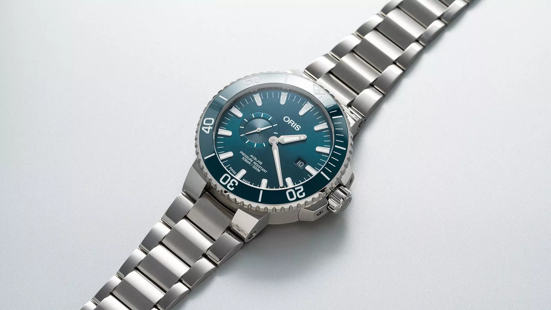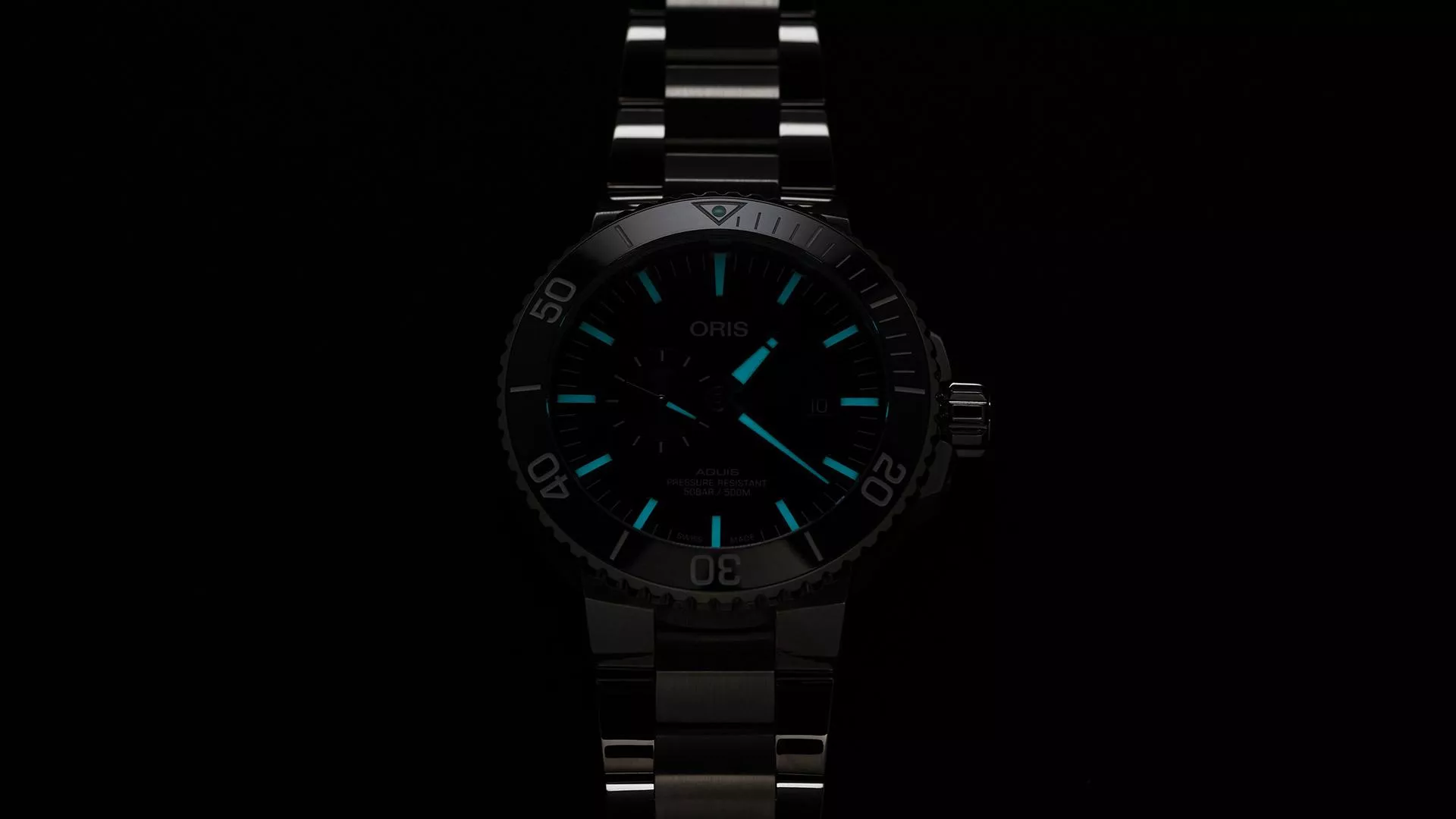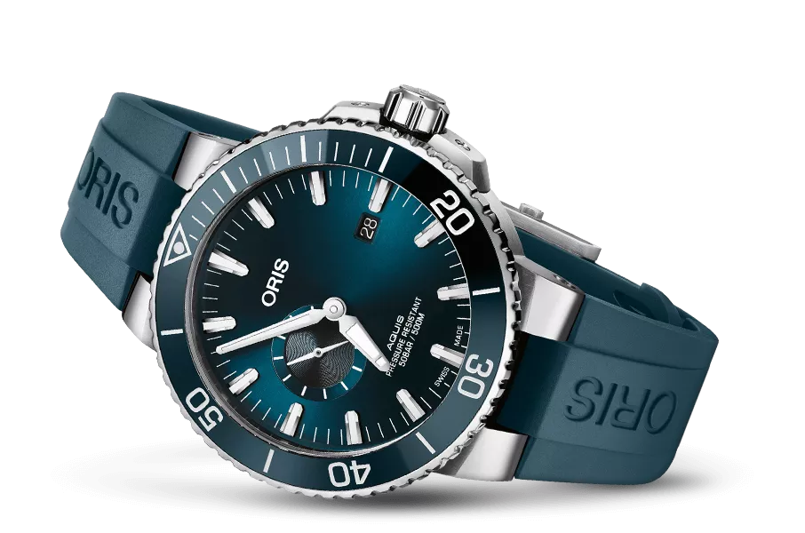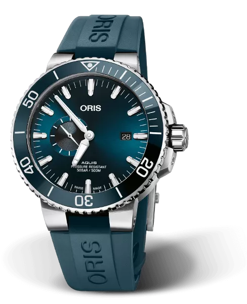 Aquis小秒盤日期錶以45.5mm的錶徑呈現,然而Oris Aquis系列專注於細節的設計,賦予錶殼、錶耳和鍊帶更服貼與絕佳的配戴舒適度,使用者無論是日常配戴或是到戶外遊玩皆合宜。同時符合對於潛水錶Aquis的期待,具備應有的可靠特色:清晰易讀性,指針Super-LumiNova螢光塗料,在光線不足的環境,依然能清楚顯示時間;防水深度50bar(500m);搭載保護裝置的旋入式錶冠;陶瓷鑲嵌的單向旋轉錶圈,以及具備Oris專利可延伸安全摺疊式錶扣的金屬錶鍊或橡膠錶帶。除了對實用性的考究,配色美學也是設計重點,陶瓷上圈與面盤的深藍色,是靈感來自深海的全新色澤。