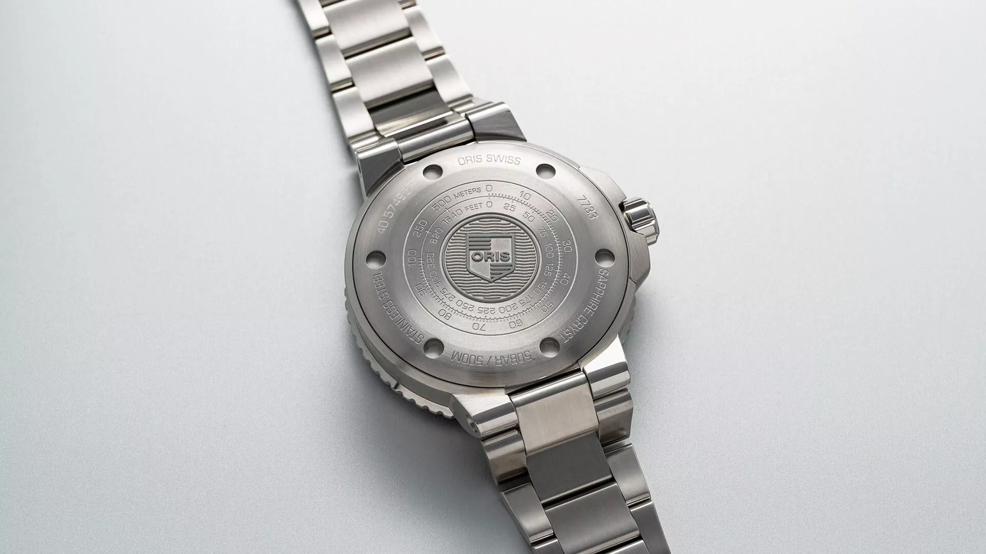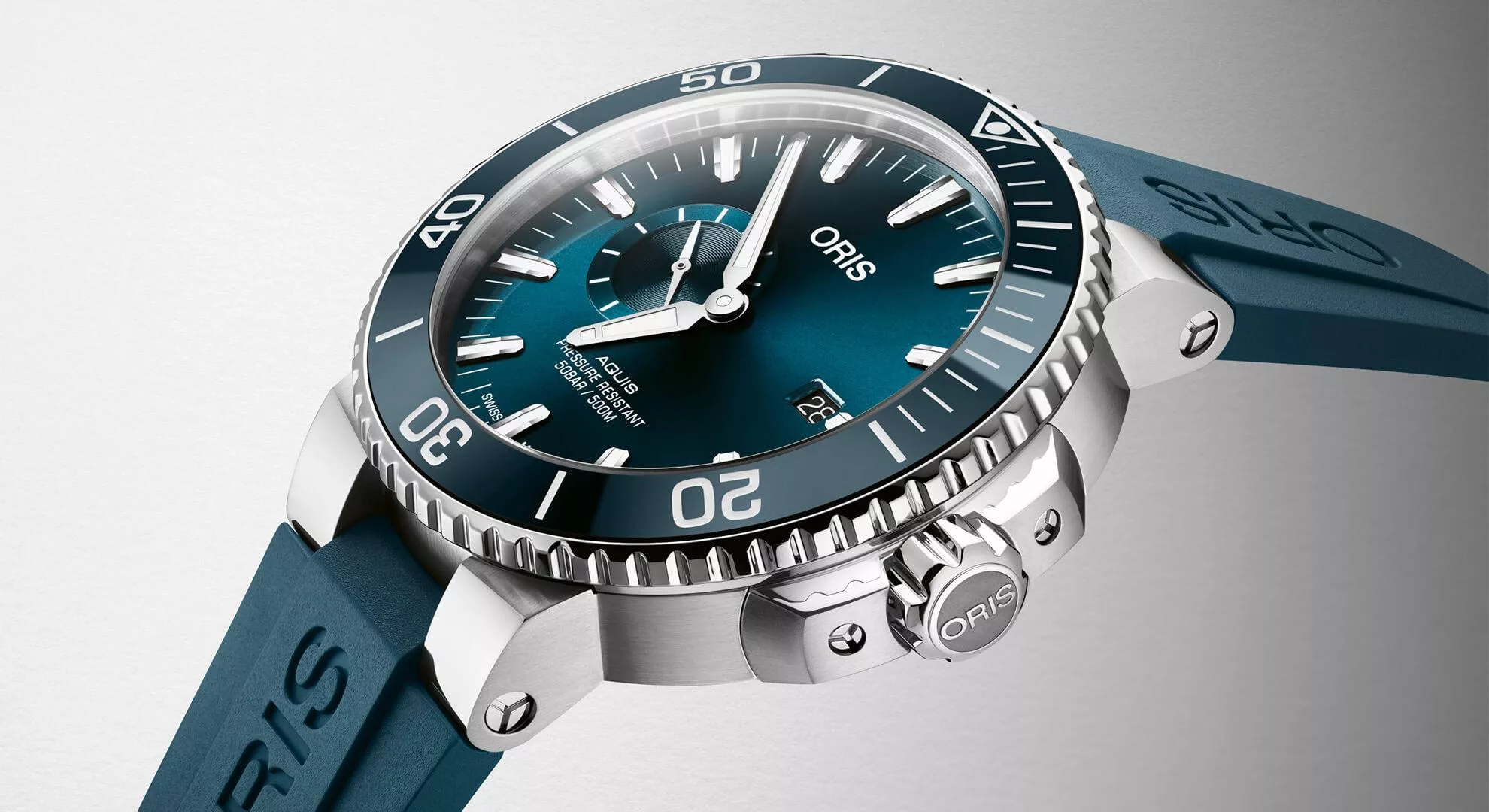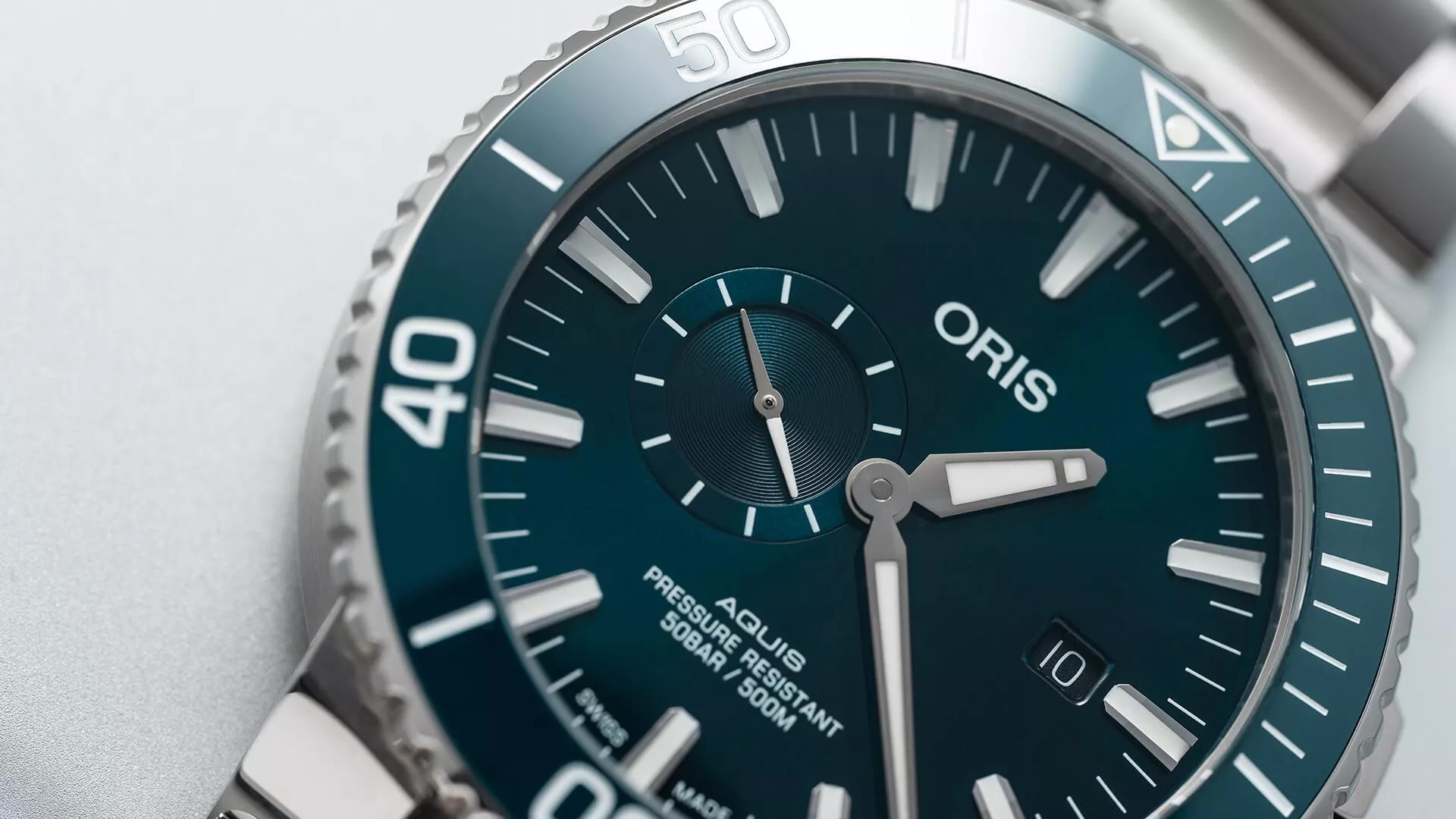 Aquis小秒盤日期錶以45.5mm的錶徑呈現,然而Oris Aquis系列專注於細節的設計,賦予錶殼、錶耳和鍊帶更服貼與絕佳的配戴舒適度,使用者無論是日常配戴或是到戶外遊玩皆合宜。同時符合對於潛水錶Aquis的期待,具備應有的可靠特色:清晰易讀性,指針Super-LumiNova螢光塗料,在光線不足的環境,依然能清楚顯示時間;防水深度50bar(500m);搭載保護裝置的旋入式錶冠;陶瓷鑲嵌的單向旋轉錶圈,以及具備Oris專利可延伸安全摺疊式錶扣的金屬錶鍊或橡膠錶帶。除了對實用性的考究,配色美學也是設計重點,陶瓷上圈與面盤的深藍色,是靈感來自深海的全新色澤。