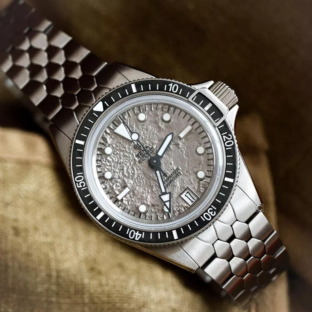 這款腕錶的設計靈感源自月球的礦物表面,鈦金屬錶盤採用油壓工藝在噴砂底面上打造而成,呈現出微妙的環形山紋理,如同月光灑落在海面上般變幻莫測。