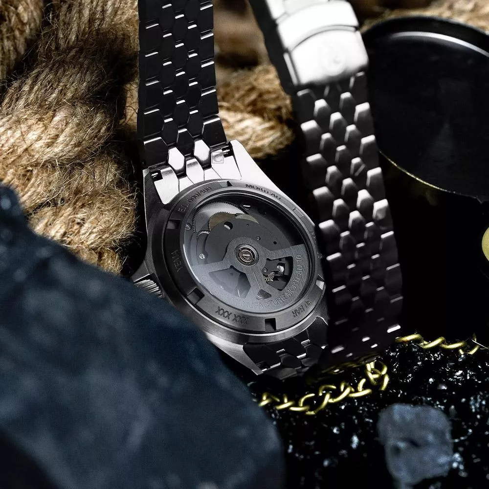 • 鈦金屬紋理錶盤錶盤錶盤與立體時標,黑色 IP 鍍層拉絲,塗覆 A 級 Super-LumiNova BGW9 處理的刻面鋼指針