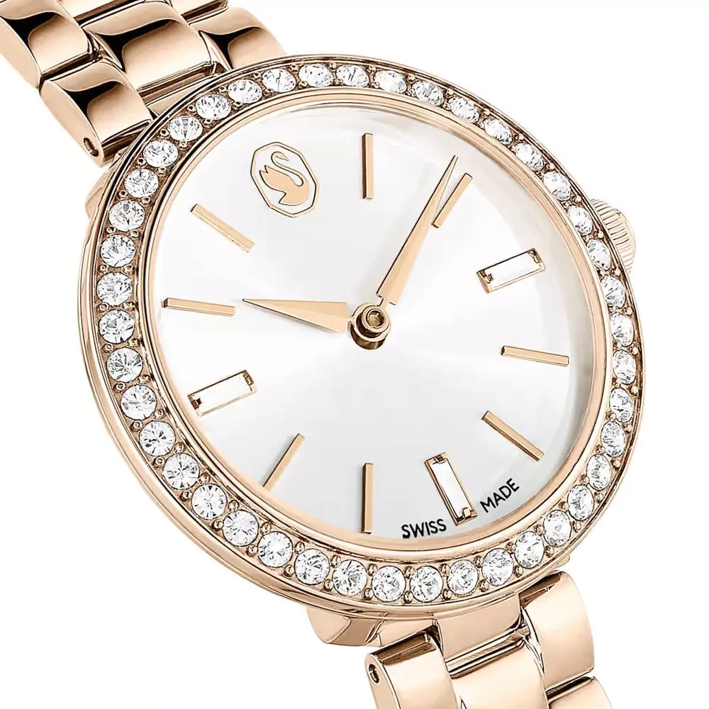 30mm 不鏽鋼錶殼採用溫暖的香檳金色調飾面,錶圈鑲有 42 顆閃耀的密鑲 Swarovski 水晶。