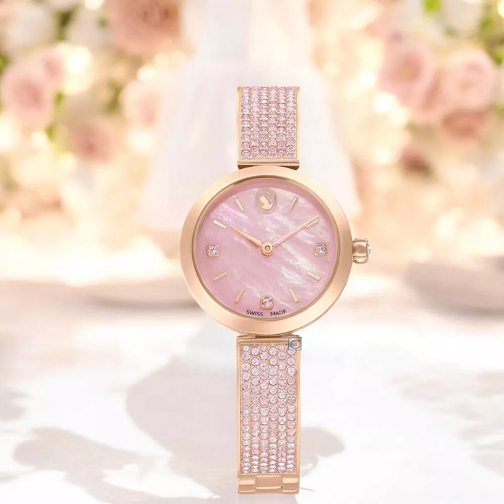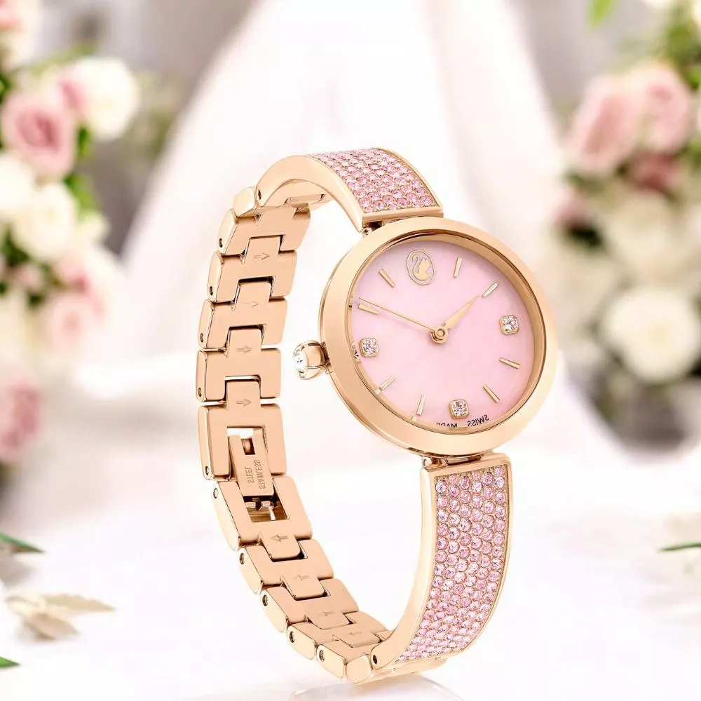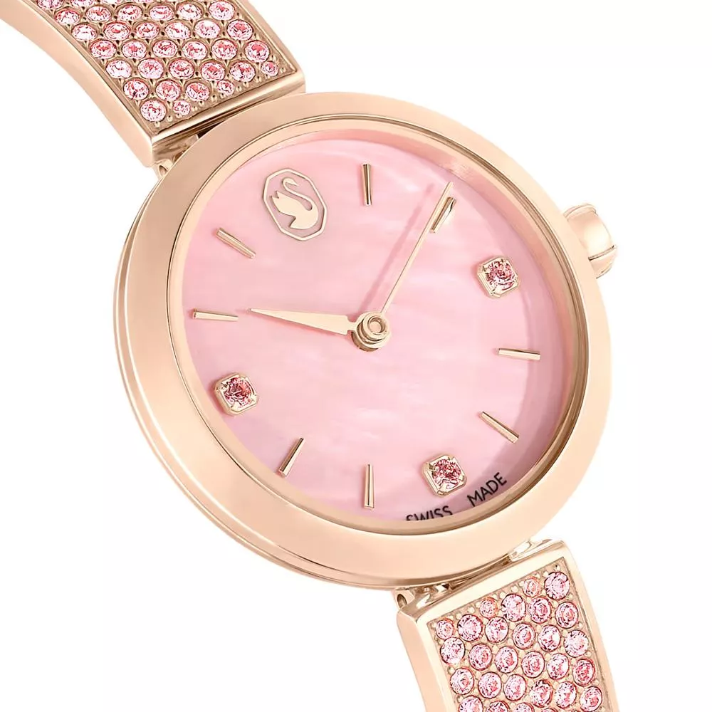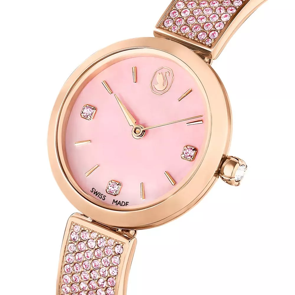 28mm 不鏽鋼錶殼採用玫瑰金色調飾面,錶冠內鑲嵌單顆 Swarovski 水晶。錶盤採用粉紅色珍珠母貝精製而成,