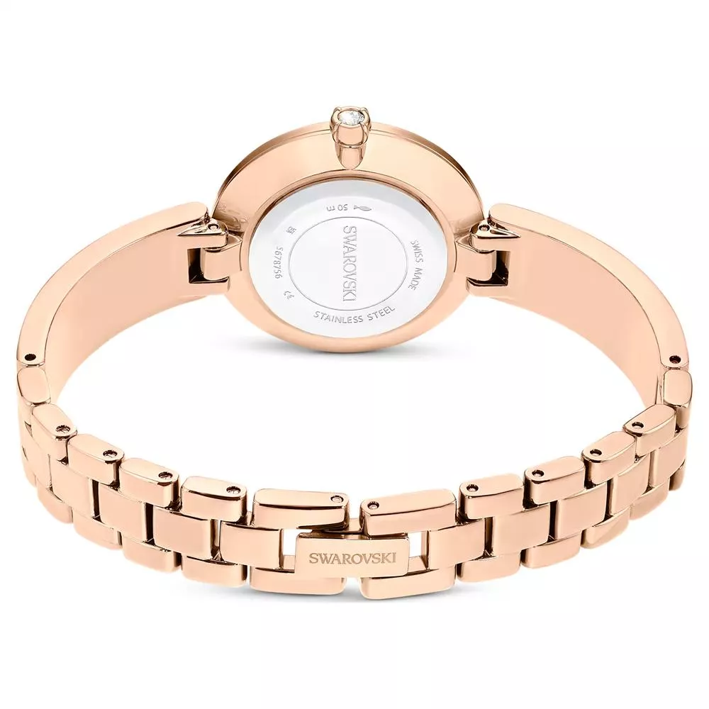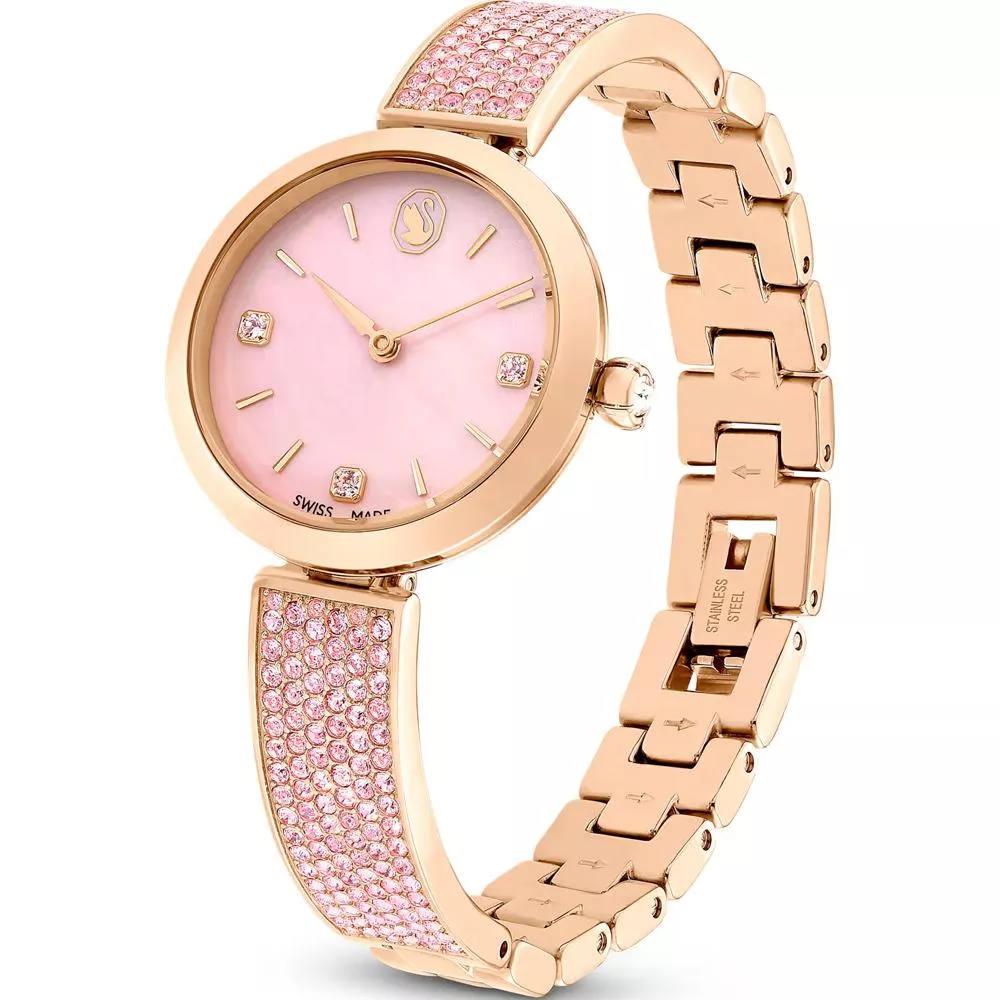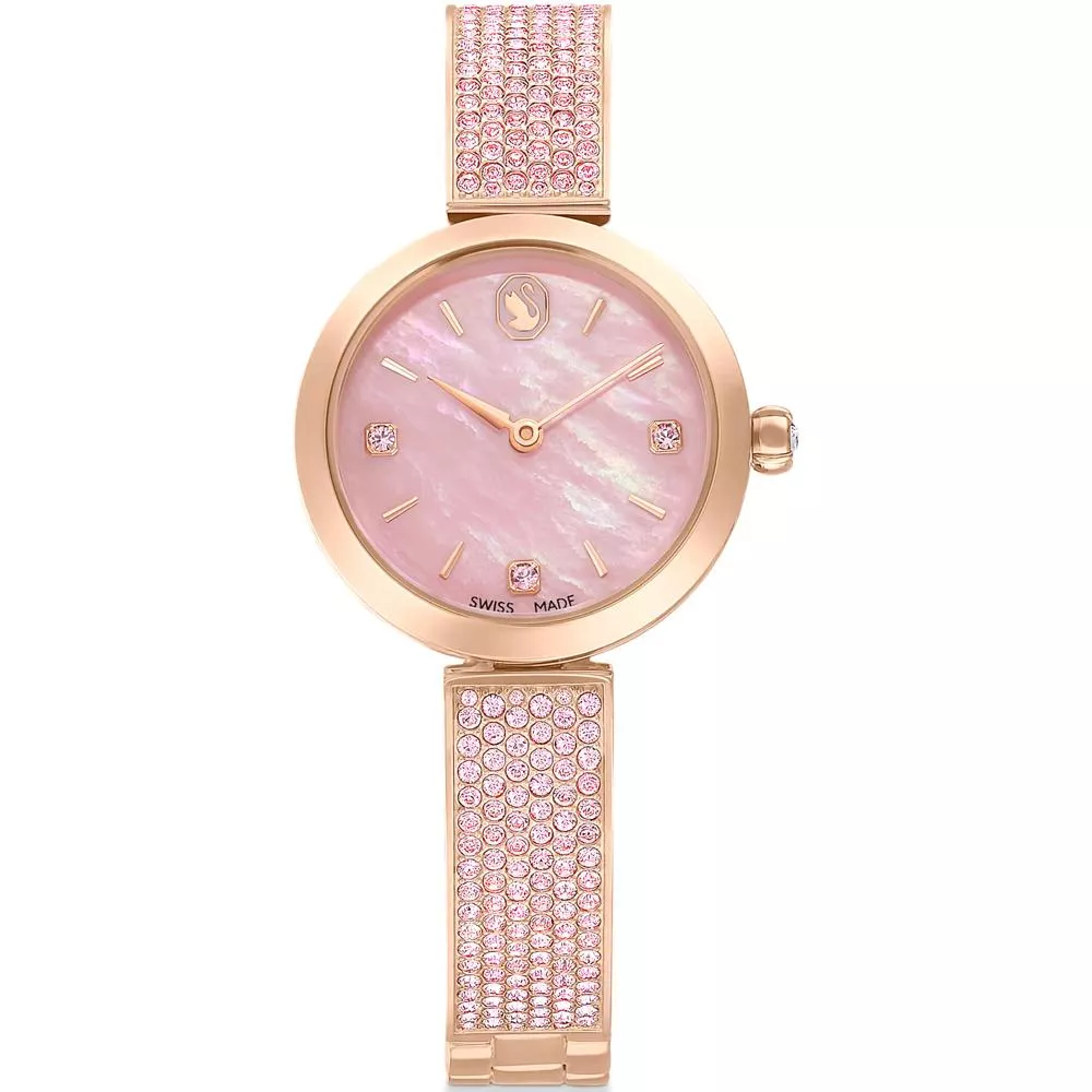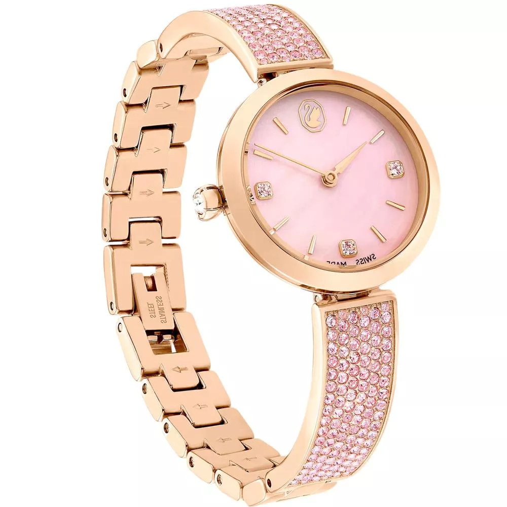 28mm 不鏽鋼錶殼採用玫瑰金色調飾面,錶冠內鑲嵌單顆 Swarovski 水晶。錶盤採用粉紅色珍珠母貝精製而成,
