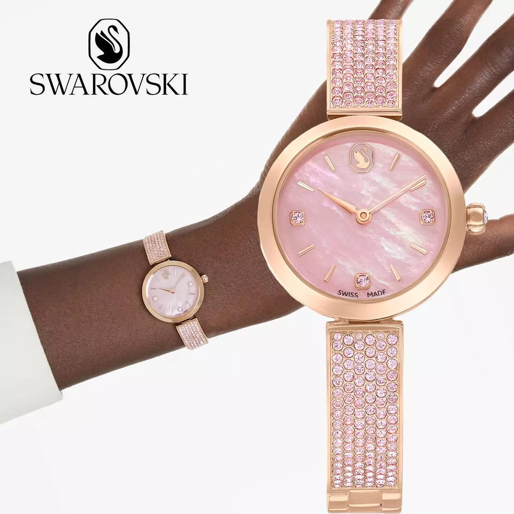 散發優雅簡約風格,三個指針標示上飾有粉紅色 Swarovski 水晶,12 點鐘位置飾有天鵝標誌。