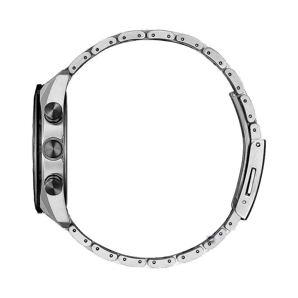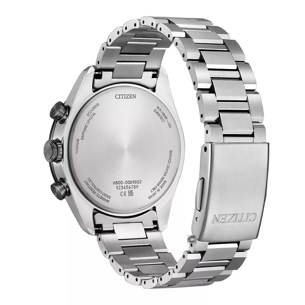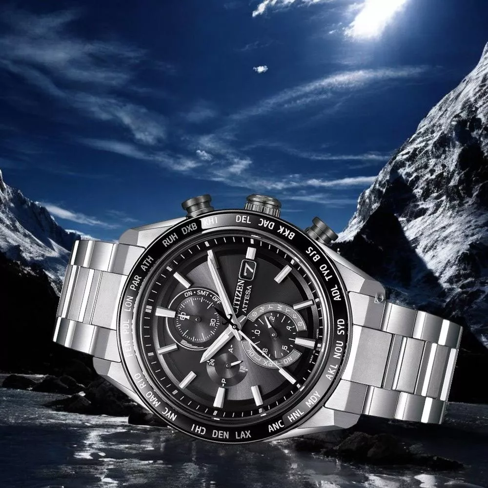 灰色錶盤上,垂直三寄存器計時碼錶正在發揮作用,其應用細節除了 3 點鐘位置日期顯示的實用性之外,還增添了立體感。其他進階功能包括 26 個時區的世界時間、帶有星期和日期指示器的萬年曆、12/24 小時計時以及動力儲存顯示。這款無線電遙控腕錶具有光動能原子計時功能,在海外旅行時可透過接收四個不同地區的當地時間訊號來自動調整時間或日曆。