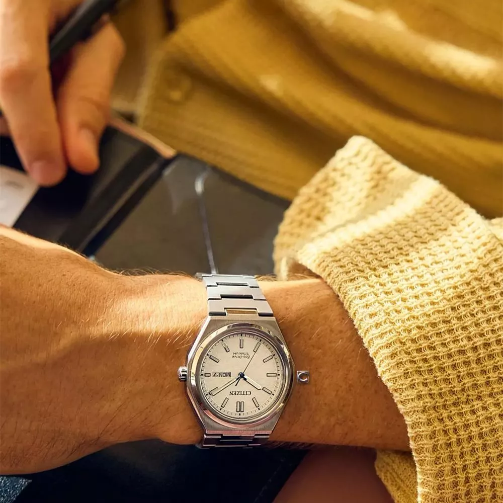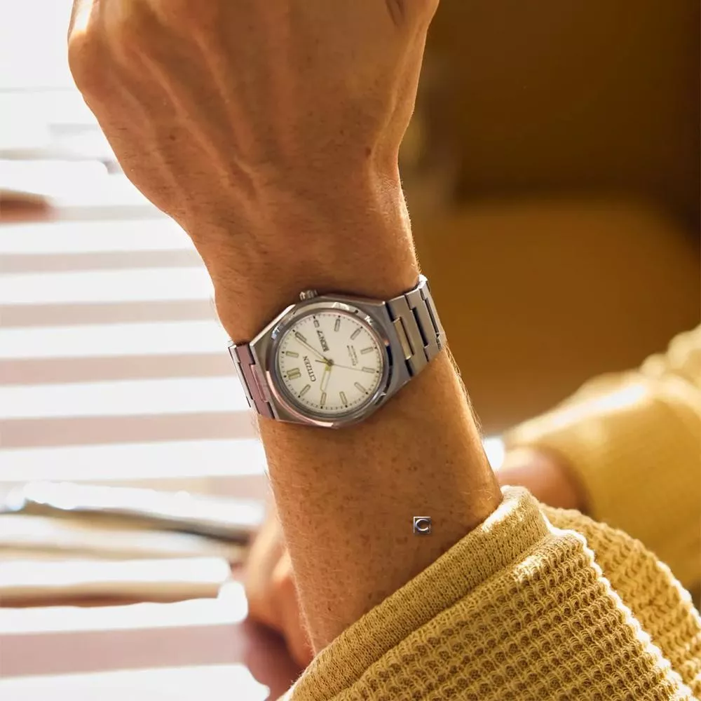 全新 Zenshin 系列腕錶融合經典比例、創新科技與鮮明現代風格,為您呈現非凡之作。腕錶採用我們獨特的 Super Titanium™ 材質打造,其硬度是精鋼的五倍,重量卻輕 40%,並具備防刮擦和防銹性能。這款運動腕錶配備 39 毫米銀色 Super Titanium™ 錶殼,經過精細拉絲和拋光處理,更顯精緻質感,並搭配同色一體式錶鍊,穩固貼合腕間。白色錶盤飾以紋理質感,黑色外圈分鐘刻度環點綴其間,銀色細節和夜光指針及刻度清晰可見。 3 點鐘位置的日期/星期顯示窗口,不僅方便日常使用,更彰顯腕錶的復古設計靈感。腕錶採用 Eco-Drive 光動能技術,無需更換電池,即可利用任何光源持續供電。