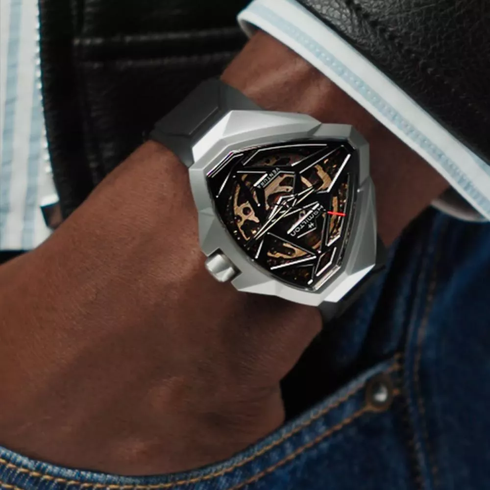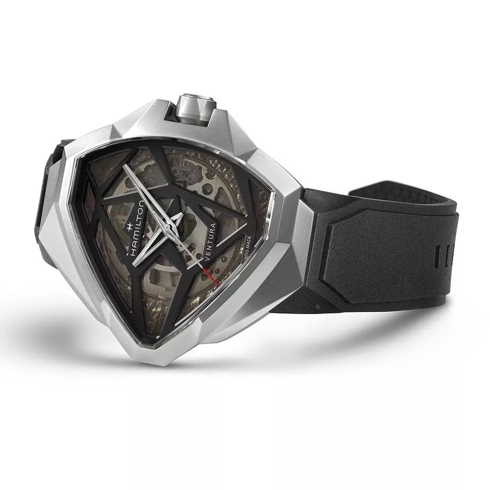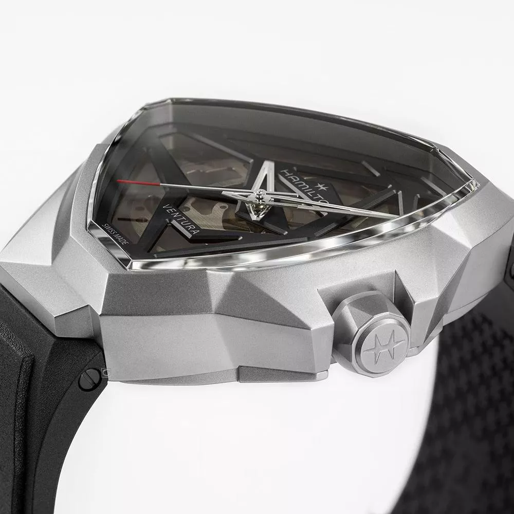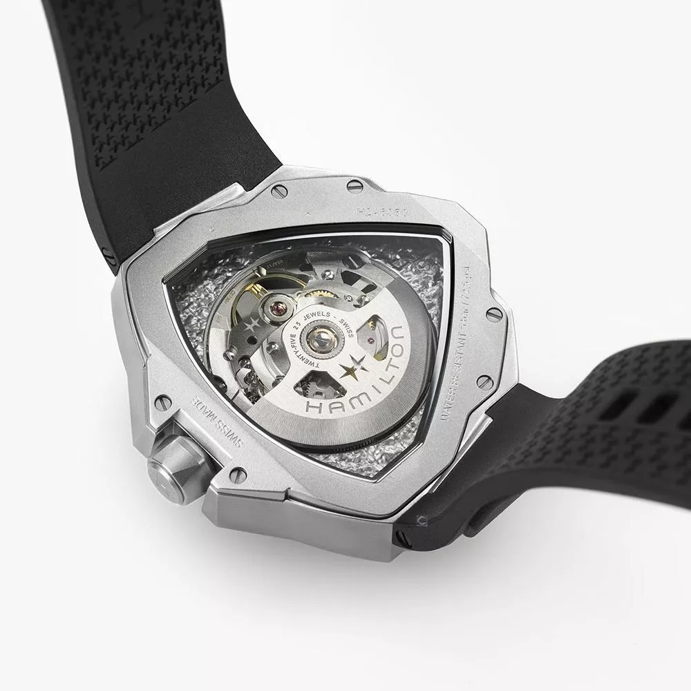 探險系列Edge鏤空腕錶一反傳統,在製錶之路上大膽向前邁進。腕錶設計創新大膽,別具建築感,跳脫探險系列錶殼代表性的三角形錶殼結構。這款時計色調深邃神秘,設計前衛,巧妙運用光影,以銀色精鋼錶殼營造對比,展現張力。搭載H-10-S機芯,透過漸變效果鏤空錶盤逐步展現。腕錶配備黑色橡膠錶帶。