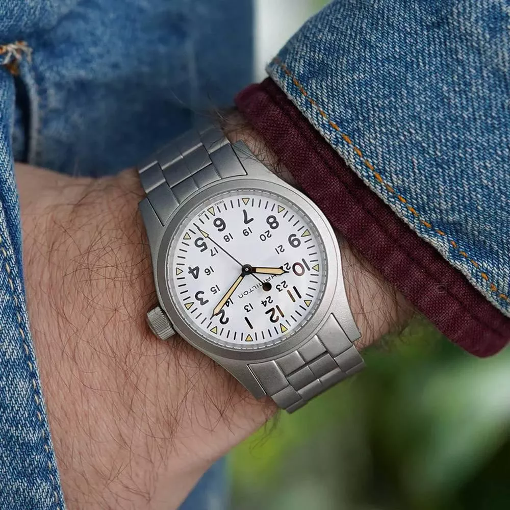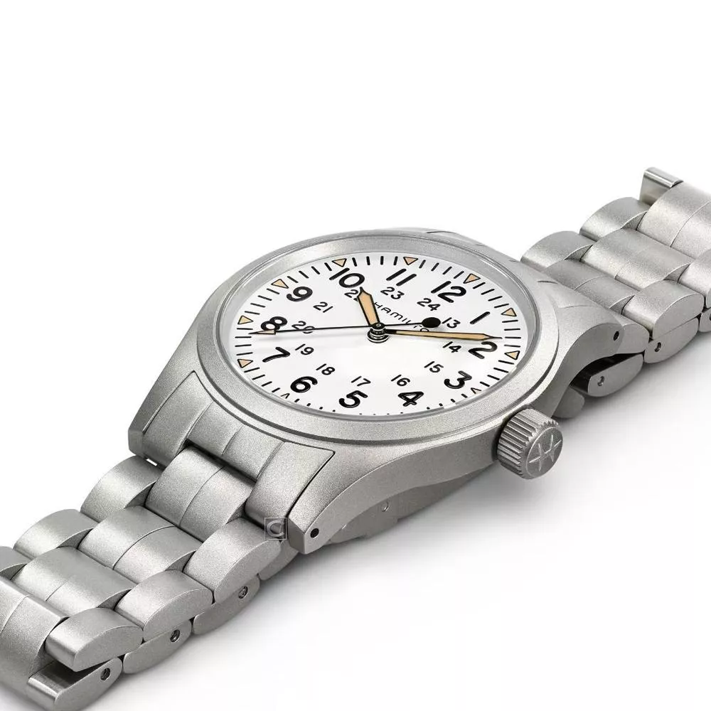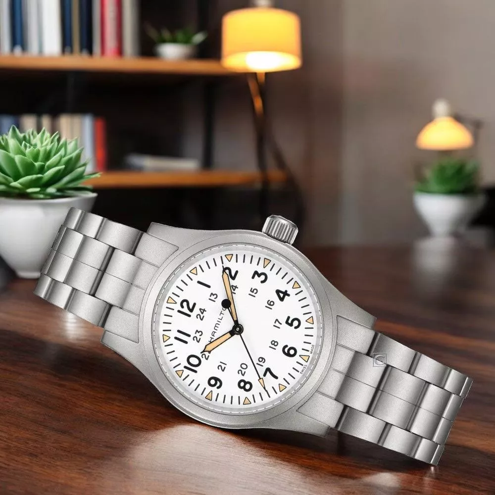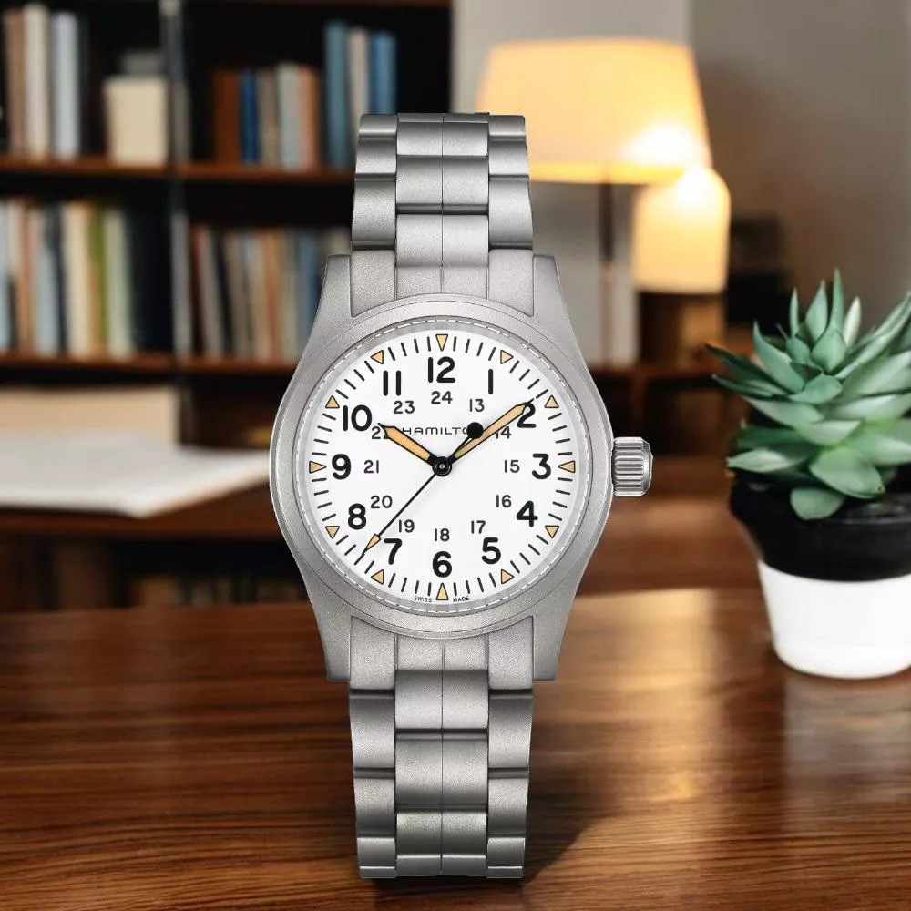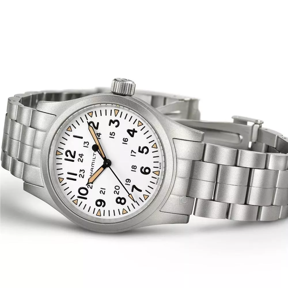 這款腕錶搭配舒適的精鋼錶鍊,以更具運動感的設計重新演繹原版軍用腕錶。全新Khaki Field卡其野戰系列38毫米Mechanical腕錶搭載Hamilton漢米爾頓H-50手動上鍊機芯,堅固耐用而精準可靠,隨時與您展開冒險旅程。