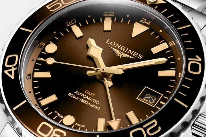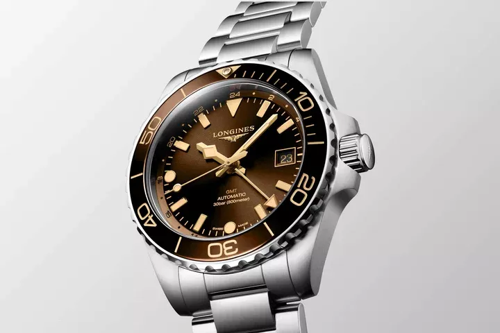 深海征服者系列(HydroConquest)GMT腕錶的錶殼直徑為41毫米,採用高質不鏽鋼材質,配備旋入式錶底和錶冠,展現出獨特的時尚風格。此款腕錶特別採用棕色陶瓷單向旋轉錶圈,上面刻有清晰的刻度並帶有夜光效果。錶盤設計以棕色為主調,您可以選擇不鏽鋼錶帶或環保材質的米色NATO錶帶,以配合您的個人風格。為腕錶增添了活力。