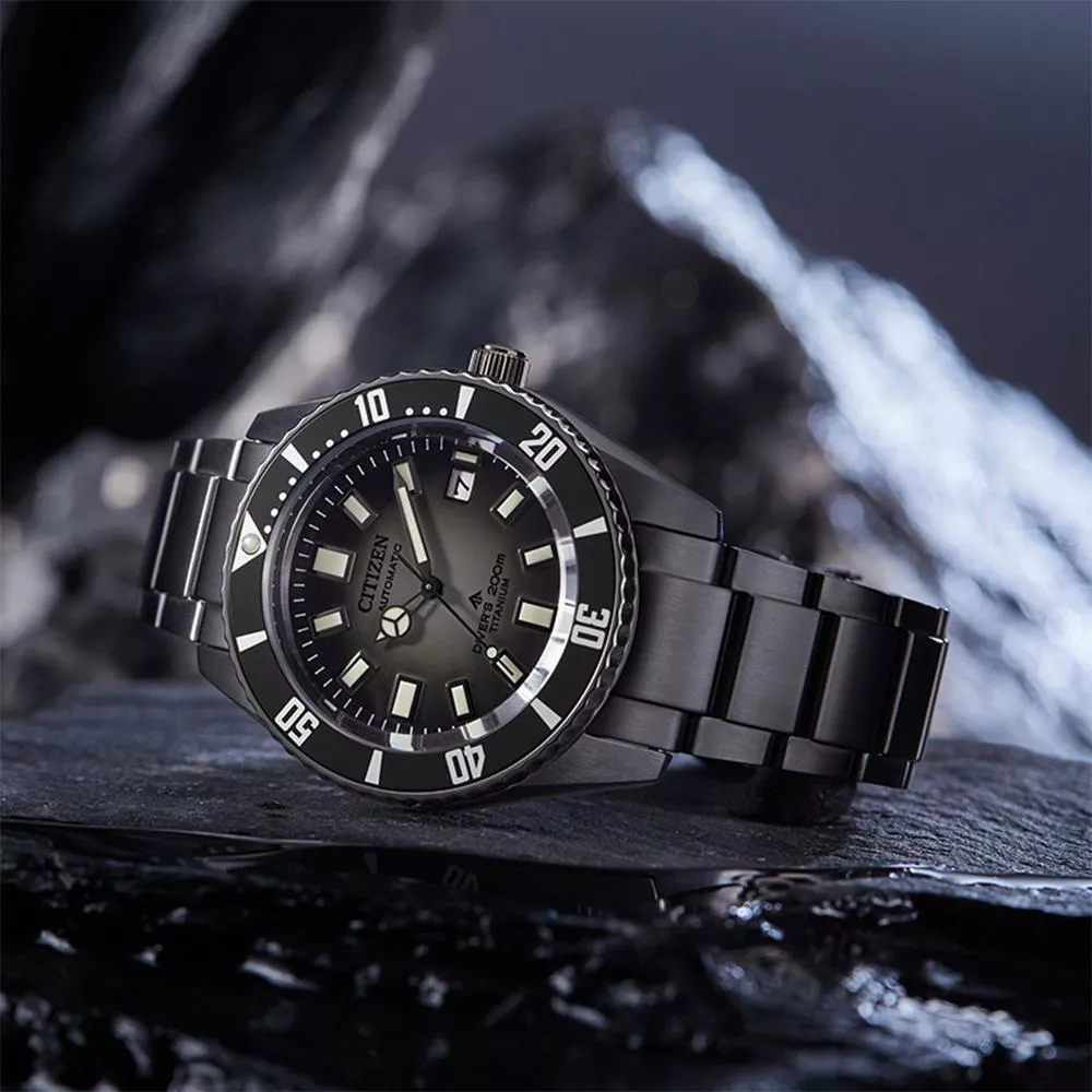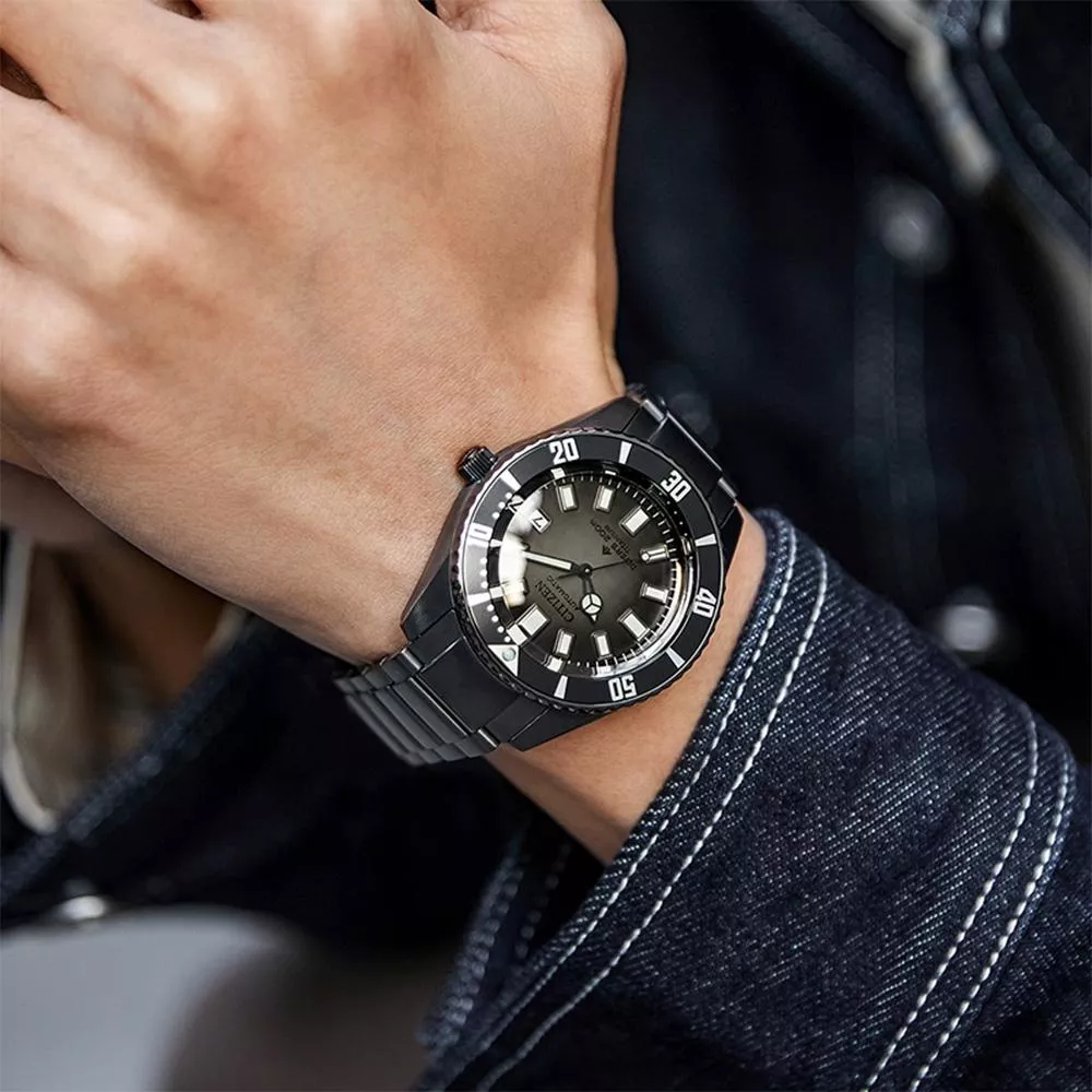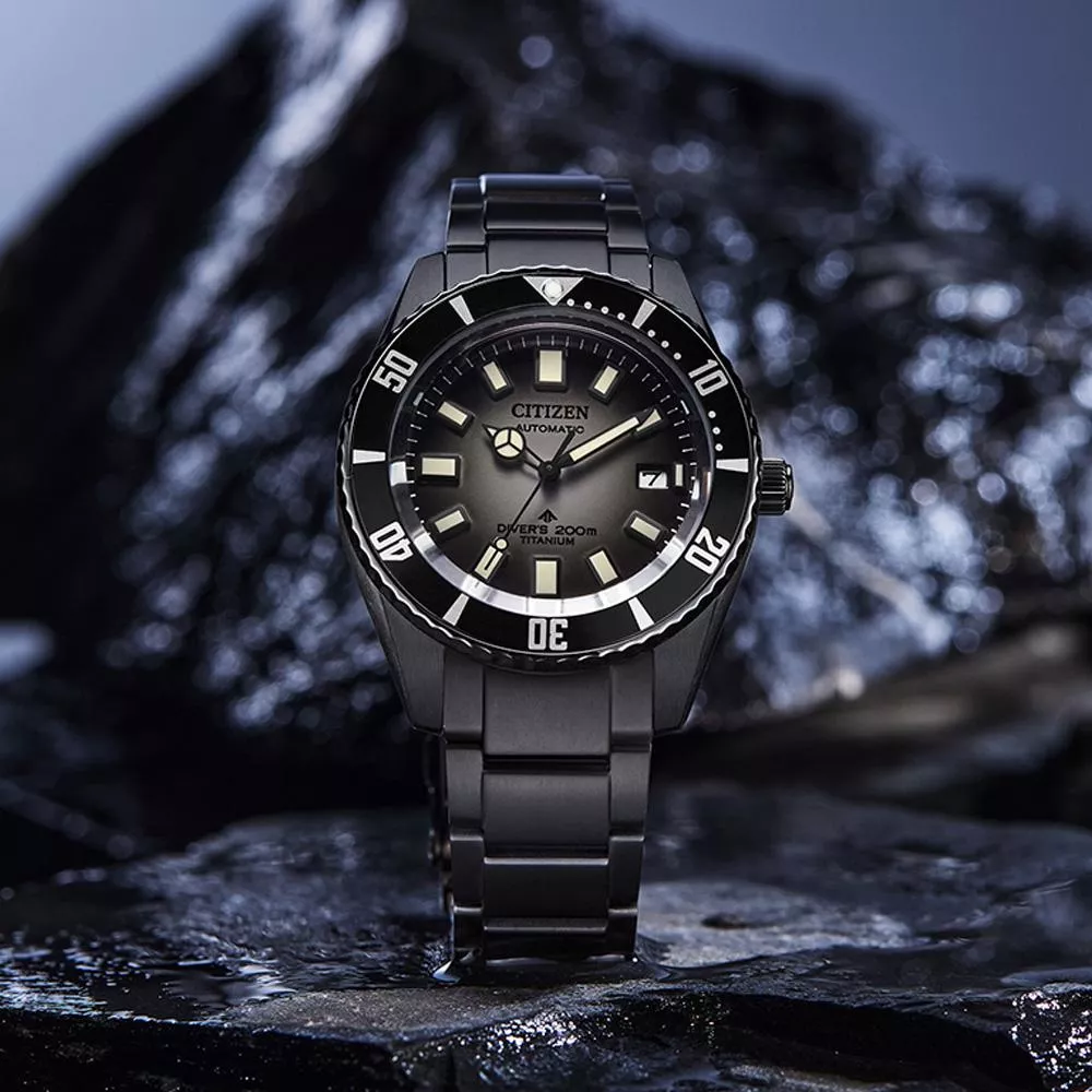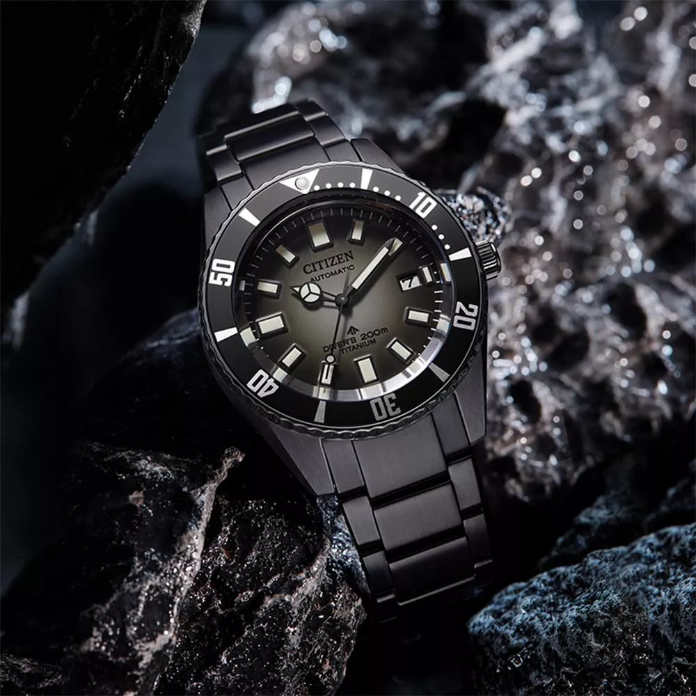 採用的是灰黑色漸變錶盤,從內而外呈現出深淺層次,讓人聯想到一道陽光穿透至海洋深處的情景,其上配搭黑色邊框夜光指針,也增加了讀時的清晰度。錶身亦採用了同色系的灰黑設計,進一步加強深邃感。除了令觀感更佳,超級鈦™錶殼及鍊帶上採用的Duratect DLC表面塗層處理也能提升耐磨損性,使其更堅固耐用。