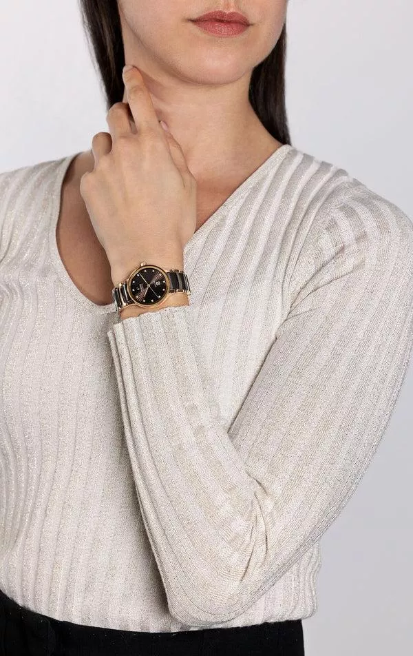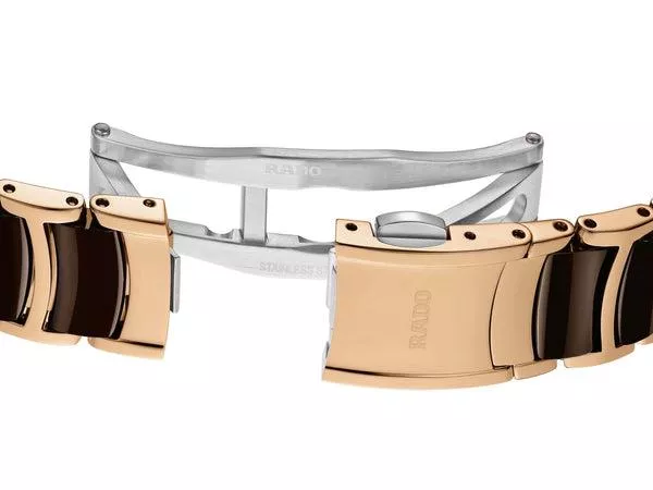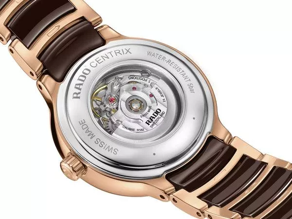 經典Centrix晶萃系列鑲鑽自動機械腕錶不僅在技術上進行調整,亦在美學上予以重新設計。修改後的錶款,擁有一個圓形的無邊框藍寶石水晶玻璃錶鏡,以及一個與弧形水晶邊緣渾然天成的弧形錶殼。調整後的錶耳和搭配棕色高科技陶瓷中央鏈節的拋光玫瑰金PVD塗層精鋼錶鏈,令這款經典時計的整體外觀更臻完美。錶盤透過壓印成型並以漆面填充,為棕色刻面錶盤創造出華麗的 3D 效果。由於搭載Nivachron™防磁游絲,使這款R582型三針機芯在3至5個位置上遠超標準測試要求,實現更高的可靠性和精確度。這款腕錶防水深度可達50公尺,並提供48小時的動力儲存。