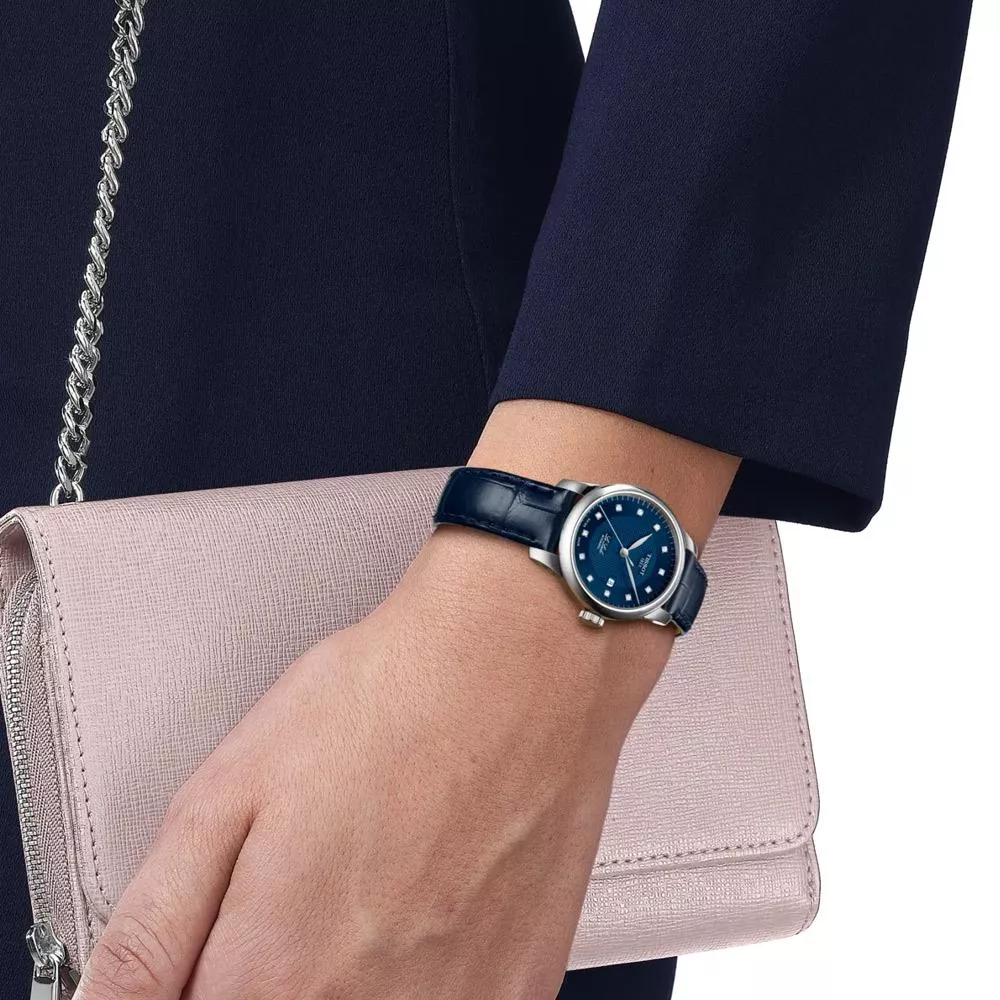 天梭 Le Locle 自動腕錶系列兼具深厚歷史底蘊與經典之美,是天梭百年來創新與製錶精神的象徵。這款腕錶配備藍色錶盤與鑲鑽時標,展現優雅與精緻光采。搭載專利 Nivachron™ 擺輪游絲,可減弱磁場影響,同時具備抗震、抗老化與耐溫差的特性。此外,腕錶設有日期顯示功能與透明背蓋,可清晰欣賞精密的瑞士機芯運轉。搭配的皮革錶帶採用蝴蝶扣與按鈕設計,可輕鬆更換,展現靈活百搭的品味