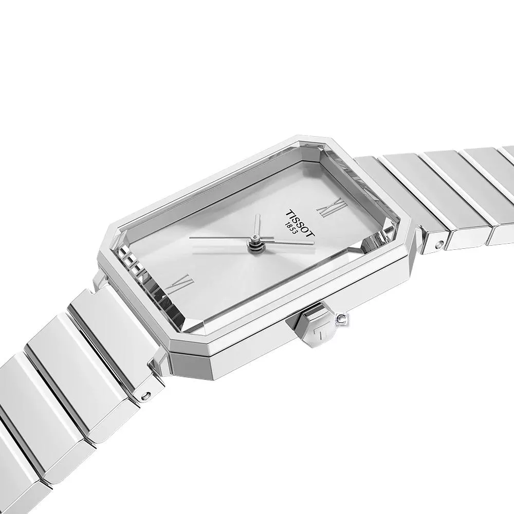 SRV 腕錶的設計靈感源自 1920 年代的裝飾藝術(Art Deco)時期。這個時期的特徵是幾何造型與抽象圖案,並成為建築、室內設計、時尚以及平面藝術中的主流風格。而 SRV 腕錶雖然直接取材自 1975 年的一款錶款,但那款設計本身便是對天梭表於1920 年代早期創作的再詮釋。 SRV 腕錶採用石英機芯,提供精準走時,讓她自信無畏地前行。搭載的電池壽命終止顯示(End-of-Life indicator)更能預先提示,確保她隨時做好準備。SRV 它不僅是一個名字,更代表 Sapphire Rectangle V:矩形切面的藍寶石水晶玻璃,其中的「V」則呼應其 5 bar 防水性能,以羅馬數字 5 象徵。 金屬錶帶舒適耐用,堅固易清潔,並能經久佩戴。