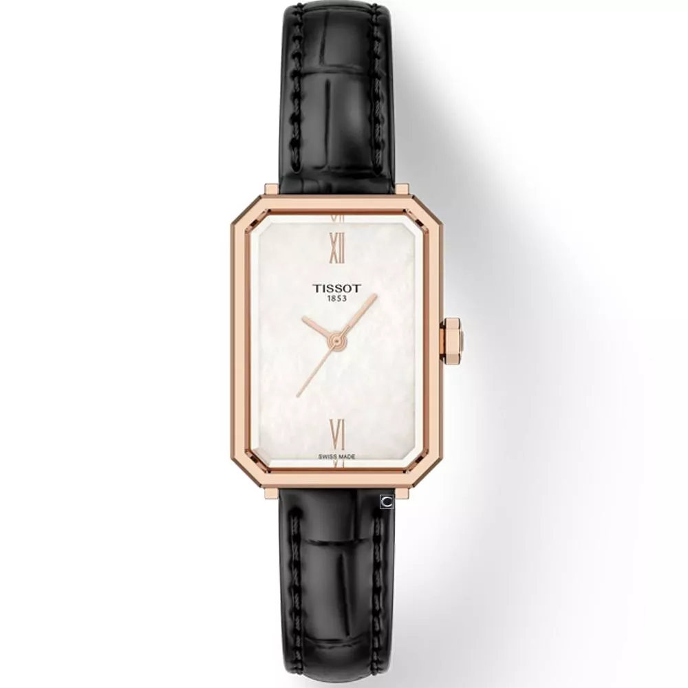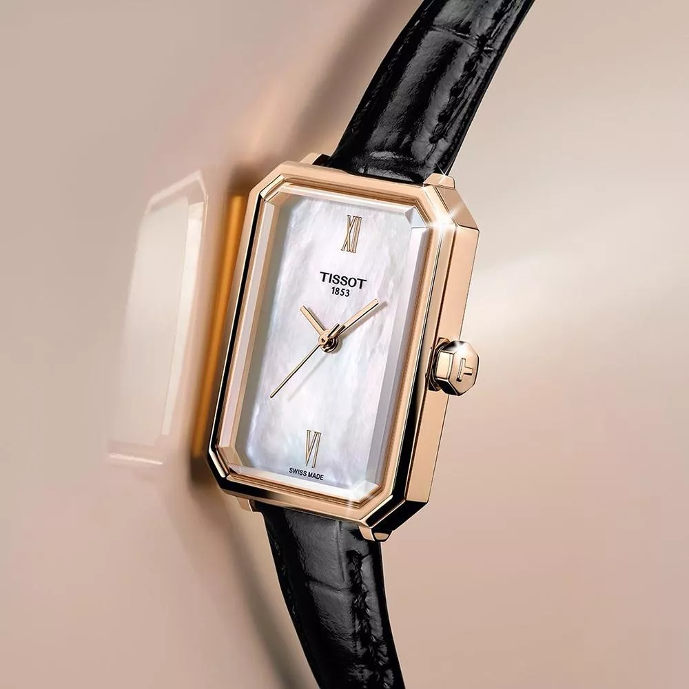 SRV 腕錶的設計靈感源自 1920 年代的裝飾藝術(Art Deco)時期。這個時代以幾何造型與抽象圖案為特色,並成為建築、室內設計、時尚以及平面藝術的主流風格。而 SRV 雖然直接取材自 1975 年的一款腕錶,但那款設計本身就是對天梭 1920 年代早期創作的再演繹。 SRV 採用石英機芯,帶來精準走時,助她自信無畏地前行。搭載的電池壽命終止顯示(End-of-Life indicator)能預先提示,讓她隨時做好準備。SRV 不僅是一個名字,更代表 Sapphire Rectangle V:具矩形輪廓的切面藍寶石水晶玻璃,其中的「V」則呼應其 5 bar 防水性能。 皮革錶帶的獨特之處,在於能隨時間演變,貼合佩戴者的手腕,帶來舒適與專屬的獨特合身感。這款搭配 珍珠母錶盤 的矩形腕錶,更能提升整體造型,並為她增添自信與舒適感。
