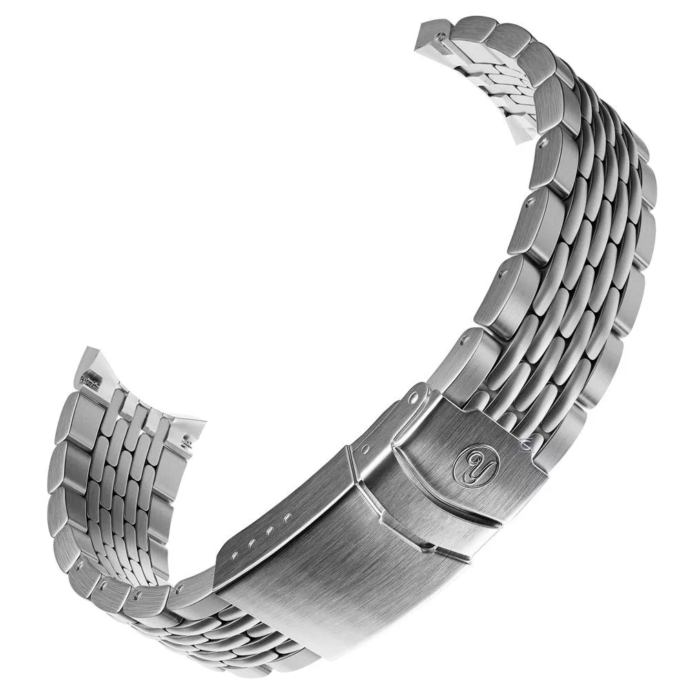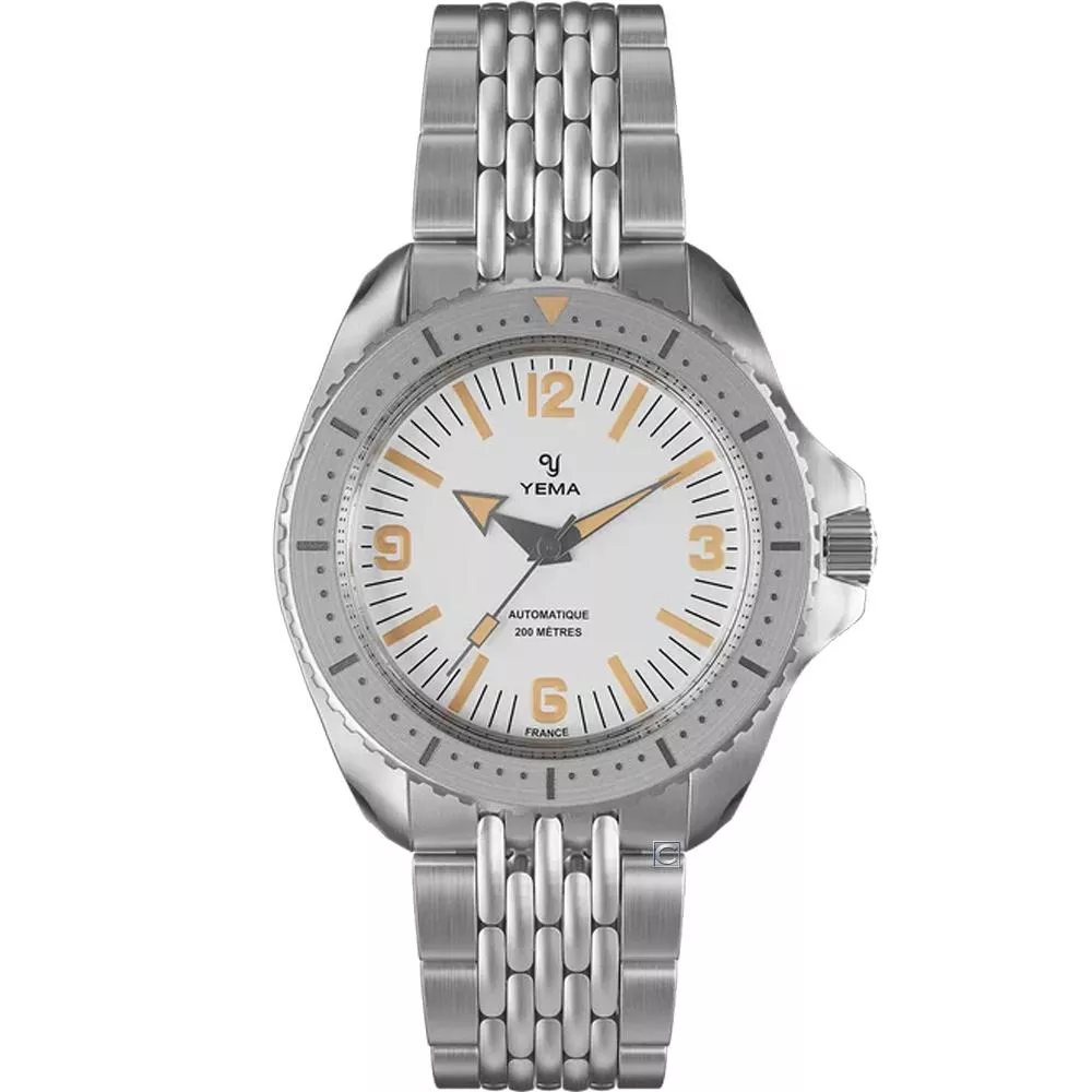 • 不銹鋼米粒帶錶鍊,搭配帶有 YEMA 復古標誌的潛水員延展折疊扣